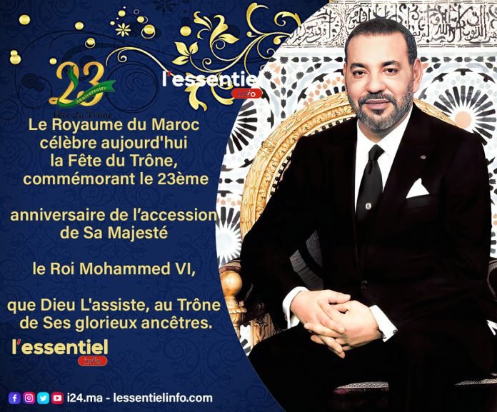 A La UneMaroc: Fête du Trône, commémorant le 23ème anniversaire de l’accession de Sa Majesté le Roi Mohammed VI au TrônePar R.ROUZKI - 30 juillet 20220250FacebookTwitterPinterestWhatsApp Le Royaume du Maroc célèbre aujourd’hui la Fête du Trône, commémorant le 23ème anniversaire de l’accession de Sa Majesté le Roi Mohammed VI, que Dieu L’assiste, au Trône de Ses glorieux ancêtres. poup