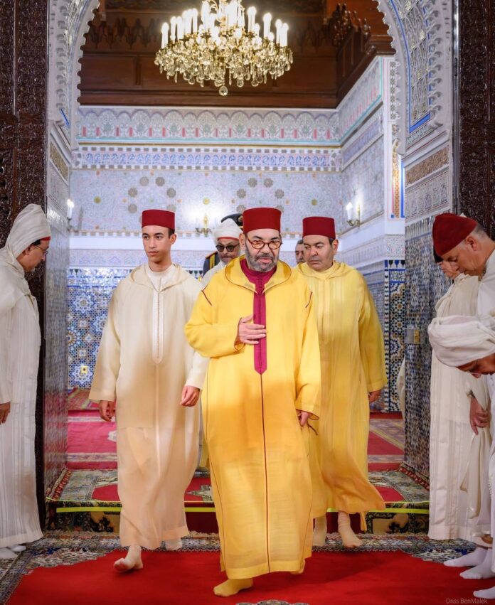 Le Souverain était accompagné de SAR le Prince Héritier Moulay El Hassan, de SAR le Prince Moulay Rachid et de SA le Prince Moulay Ahmed.