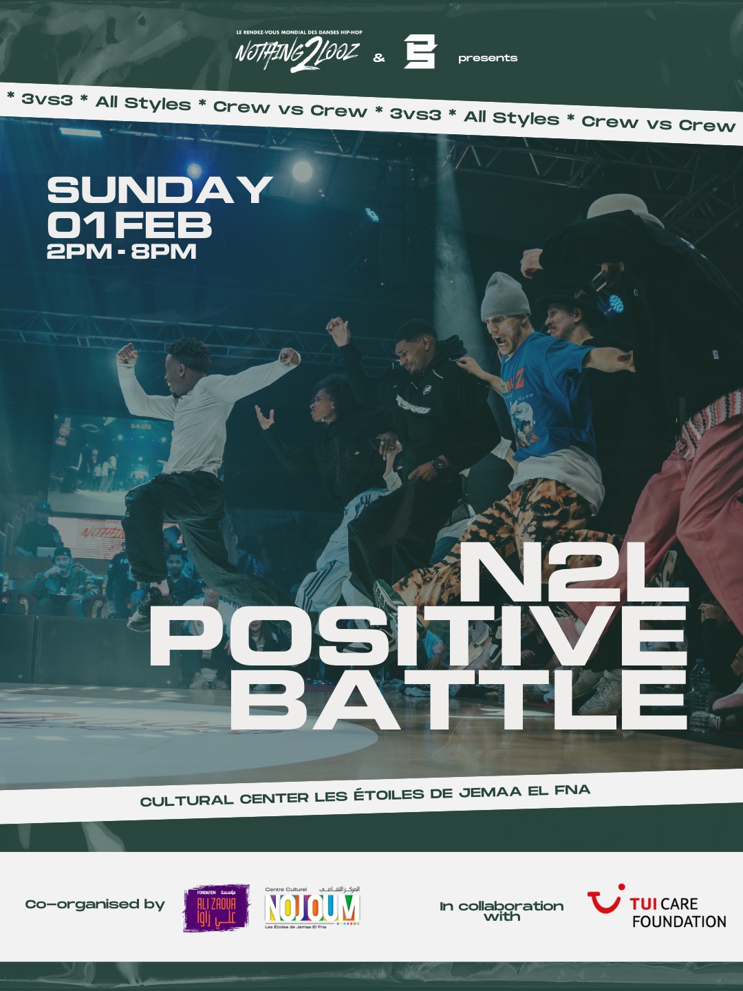 Cet événement est le fruit d’un partenariat entre Nothing2Looz, rendez-vous international reconnu des danses hip-hop, et Positive School, structure marocaine engagée dans la transmission et la valorisation de la culture urbaine.
