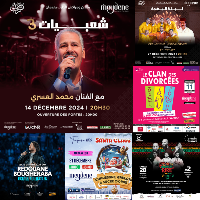 En décembre 2024, le Meydene Marrakech s’affirme comme l’épicentre culturel de la ville ocre, avec une programmation variée qui promet des expériences inoubliables. Entre comédie, musique traditionnelle et stand-up, chaque spectacle vous invite à une immersion unique dans des univers artistiques diversifiés. Voici les événements à ne pas manquer :