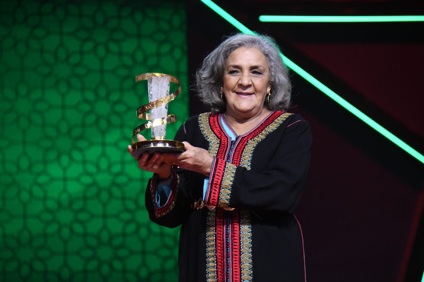L’actrice a reçu l’Étoile d’Or, remise par le réalisateur Nour-Eddine Lakhmari, sous une longue ovation du public. Cette distinction salue une carrière marquée par un engagement profond et une contribution majeure au cinéma marocain.