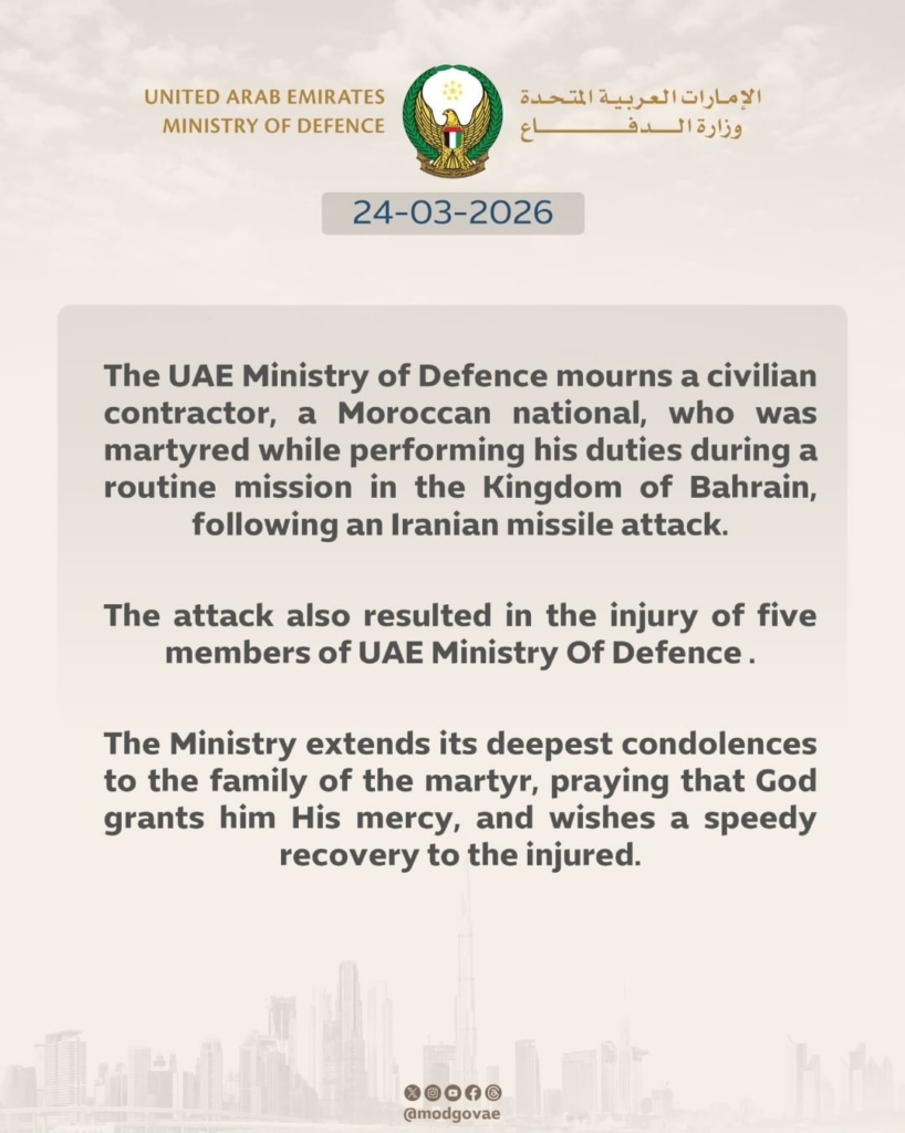 Le ministère de la Défense des Émirats arabes unis a annoncé la mort d’un contractant civil marocain, décédé lors d’une mission de routine au Royaume de Bahreïn, à la suite d’une attaque de missile attribuée à l’Iran.
