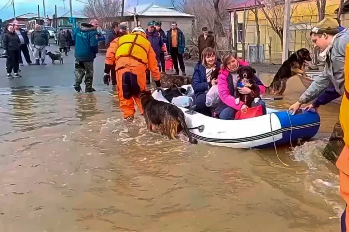 Les équipes d’urgence évacuent les résidents locaux avec leurs animaux de compagnie après l’effondrement d’une partie du barrage, entraînant des inondations à Orsk en Russie.