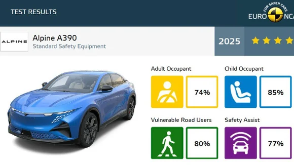 Proposée autour de 67 500 €, l’Alpine A390 affiche 74 % en protection des adultes.