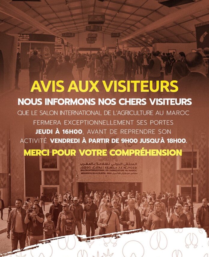 Le Salon international de l’agriculture au Maroc annonce une fermeture exceptionnelle de ses portes ce jeudi à 16h00.
