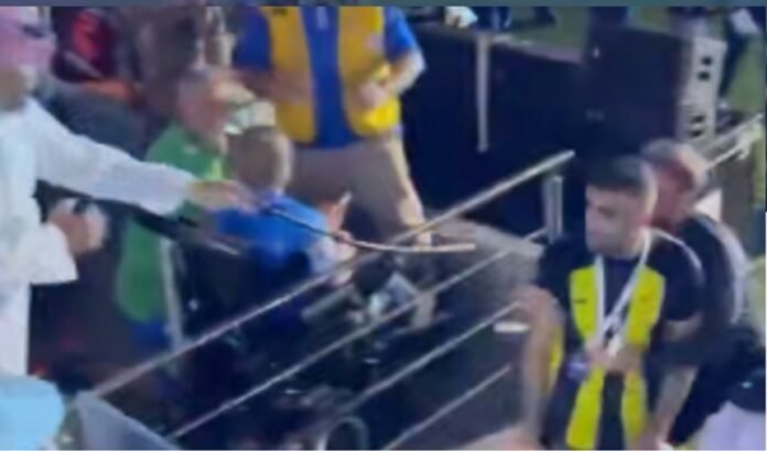 Après le coup de sifflet final du match remporté jeudi par Al Hilal contre Al Ittihad 4-1 à Abu Dhabi, une bagarre a éclaté entre Hamdallah, qui avait marqué le seul but de l’équipe perdante, et un supporter qui a répliqué à son arrosage d’eau en le frappant avec un fouet.