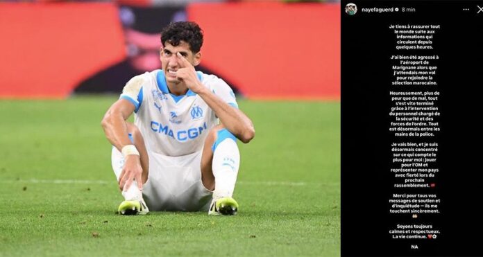 L’international marocain Nayef Aguerd, défenseur de l’Olympique de Marseille, a été victime d’un incident ce lundi matin à l’aéroport de Marignane, dans le sud de la France, alors qu’il s’apprêtait à prendre un vol vers le Maroc pour rejoindre le rassemblement de l’équipe nationale.